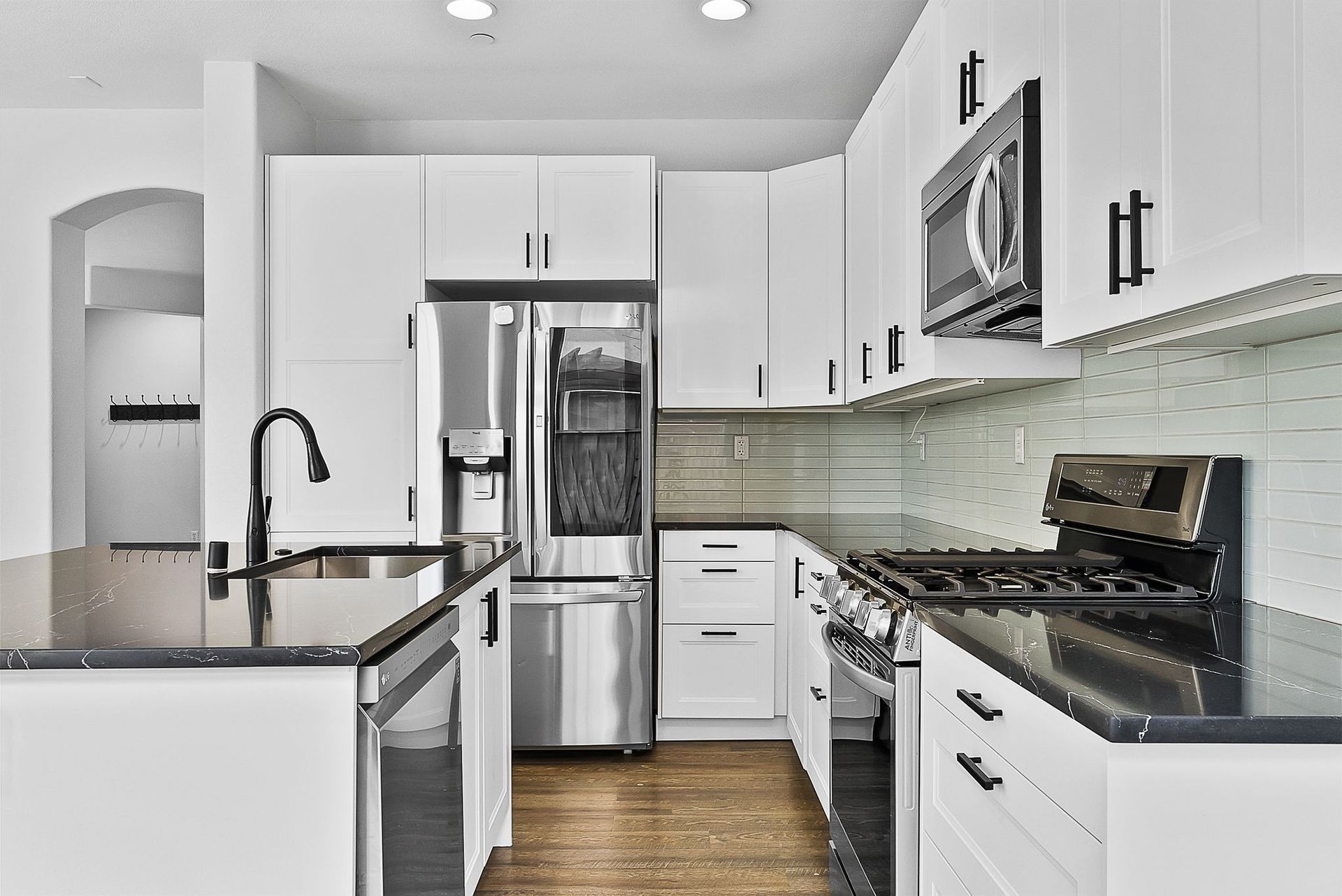 Step into this light-filled, contemporary kitchen where abundant natural light creates a warm and inviting atmosphere that seamlessly connects to the family room. Featuring ample cabinetry, expansive quartz countertops and modern stainless-steel appliances, the space is both functional and stylish. Enjoy casual dining at the breakfast bar or savor peaceful backyard views while cooking. This kitchen truly serves as the heart of the home. into this bright, contemporary kitchen where natural light pours in, creating a cozy and welcoming vibe that flows effortlessly into the family room.