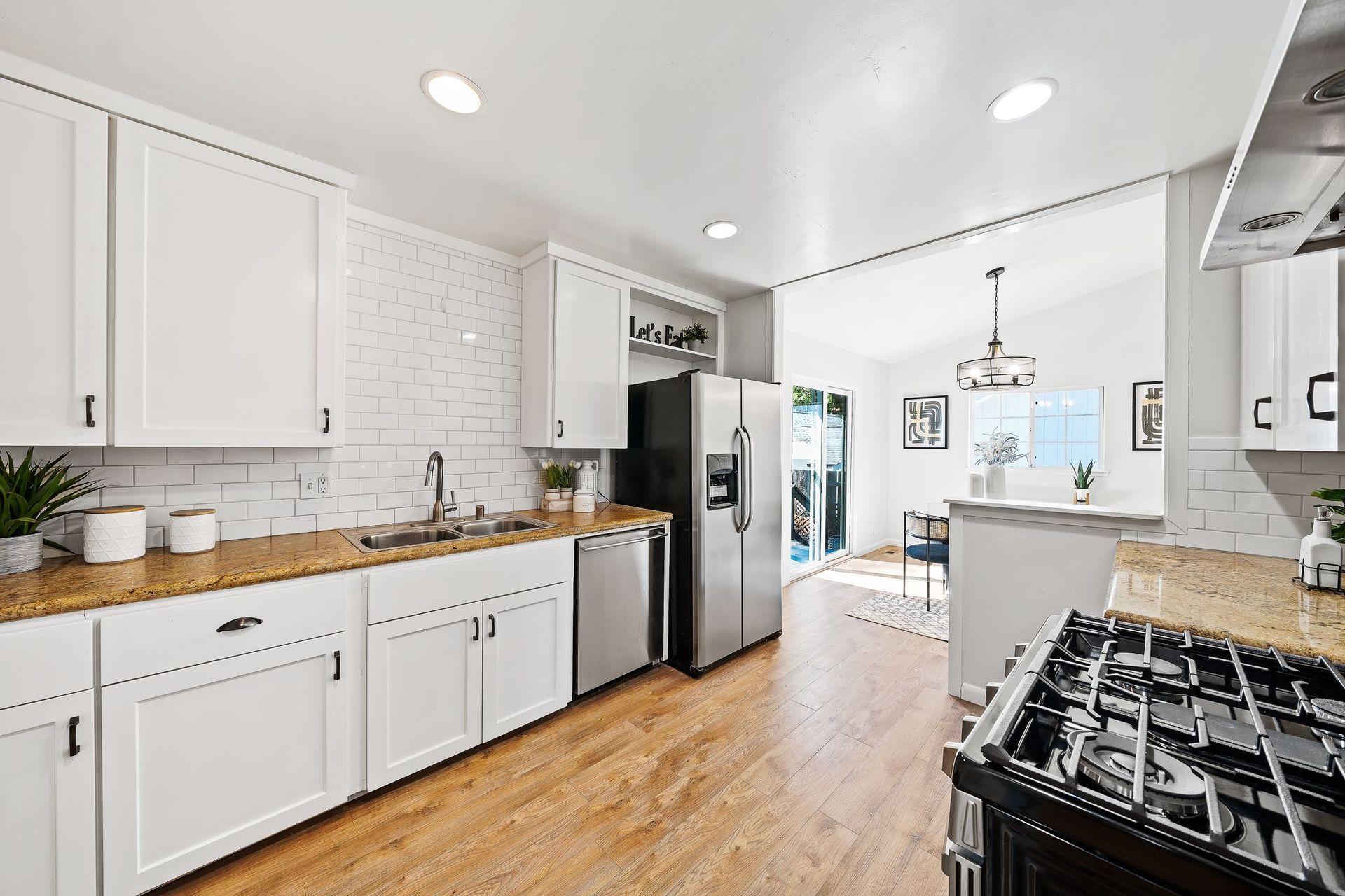 This dining space overflows to the outside deck with a view of the lush backyard. The kitchen is adjacent to the dining room and has stainless steel appliances, granite countertops, bright, white cabinets with contemporary subway tile backsplash.