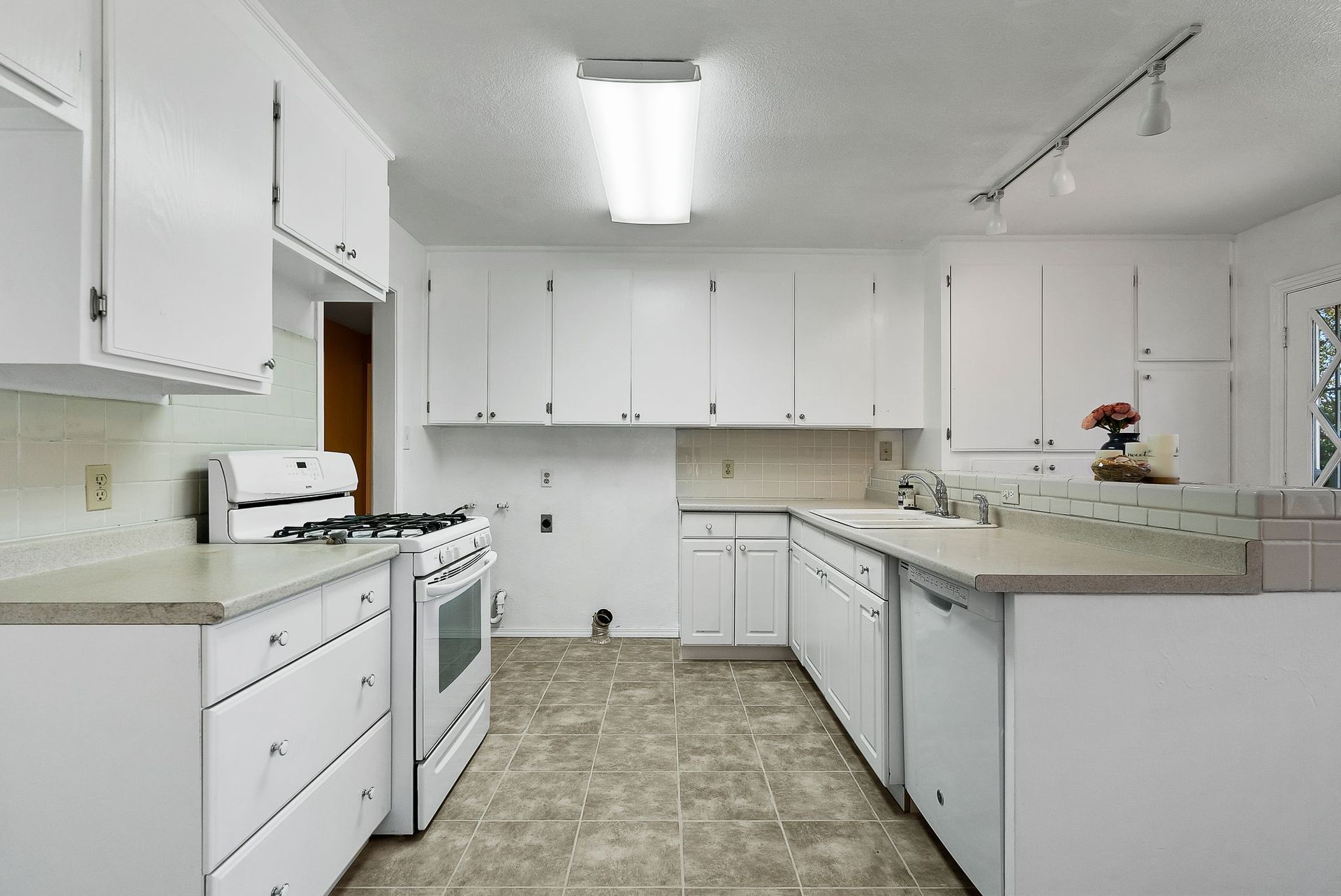 This bright, white kitchen has lots of counter top space and cabinets! Enjoy coffee in the breakfast nook.