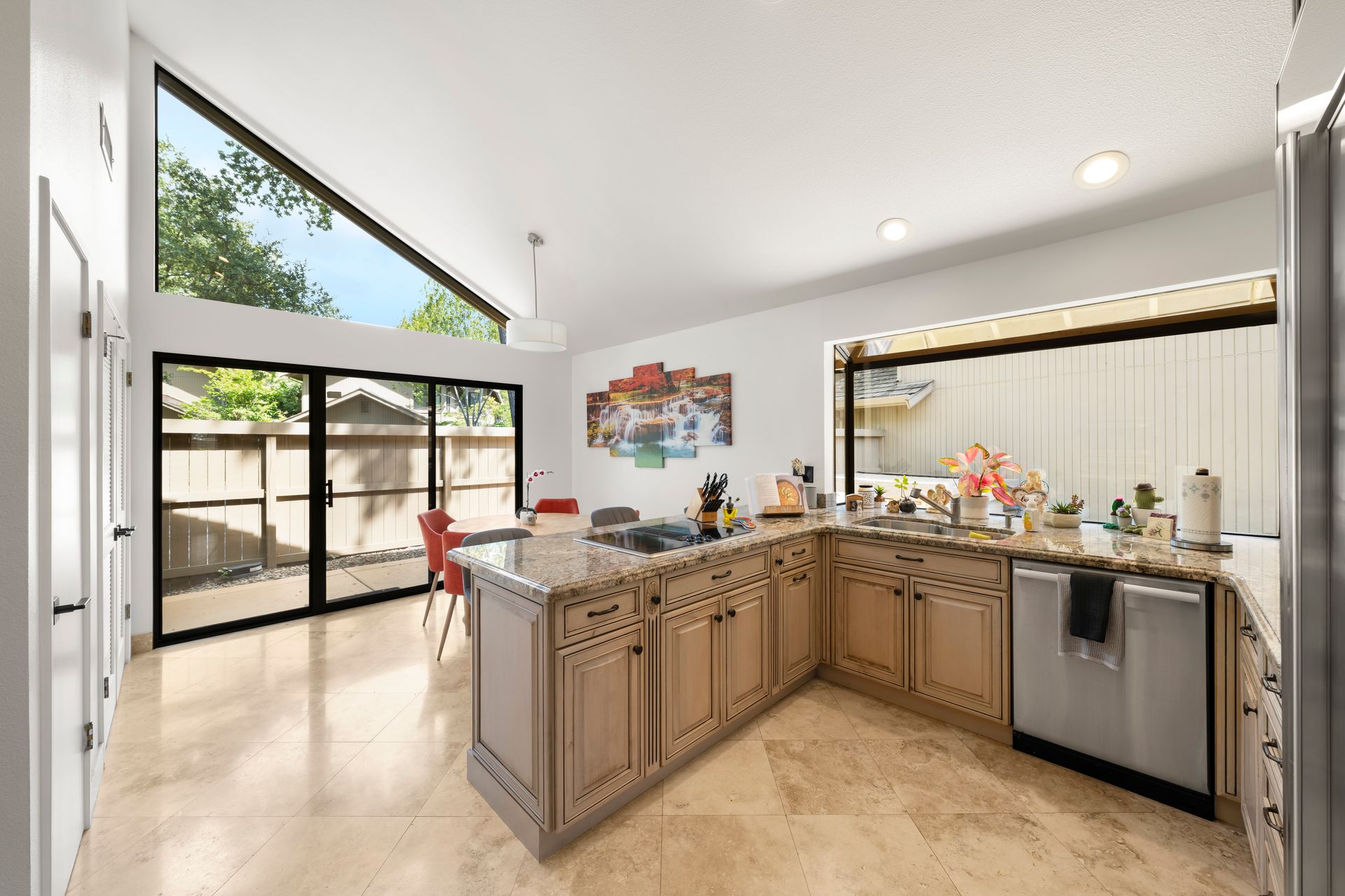 This home has the wow factor! Nestled in the gated community of Promontory Point Village, this beautifully 2 bedroom, 2 bath single-story Gold River residence offers a modern, light-filled interior designed for effortless living. Step into an expansive living and dining area highlighted by soaring vaulted ceilings, updated lighting, and a striking fireplace that creates a warm and inviting ambiance. This thoughtfully designed space flows effortlessly and includes a versatile area perfect for a home office, media room, or relaxing retreat, complete with built-in cabinetry for added style and functionality. The chef’s kitchen is a true centerpiece, showcasing expansive granite countertops, state-of-the-art appliances, a large picture window, a generous pantry, dining bar and a charming breakfast nook. The spacious primary suite offers private patio access, creating a peaceful retreat. The en-suite bath features an updated vanity and a large closet. The additional bedroom has ample close space. The home features a centrally located bathroom for added convenience. Additional highlights include an inside laundry area and a two-car garage. Step outside to your own private oasis. The inviting courtyard entry sets the tone, while the updated patio space is designed for outdoor living and dining. Enjoy the top of the line personal spa & garden bed, all thoughtfully designed for low-maintenance enjoyment and year-round relaxation. Residents of Promontory Point enjoy exceptional community amenities including tennis, pickleball courts, pool, spa & clubhouse, perfect for connecting with neighbors. Conveniently located near shopping, parks, restaurants & the American River Parkway & Gold River Racquet & Swim Club.