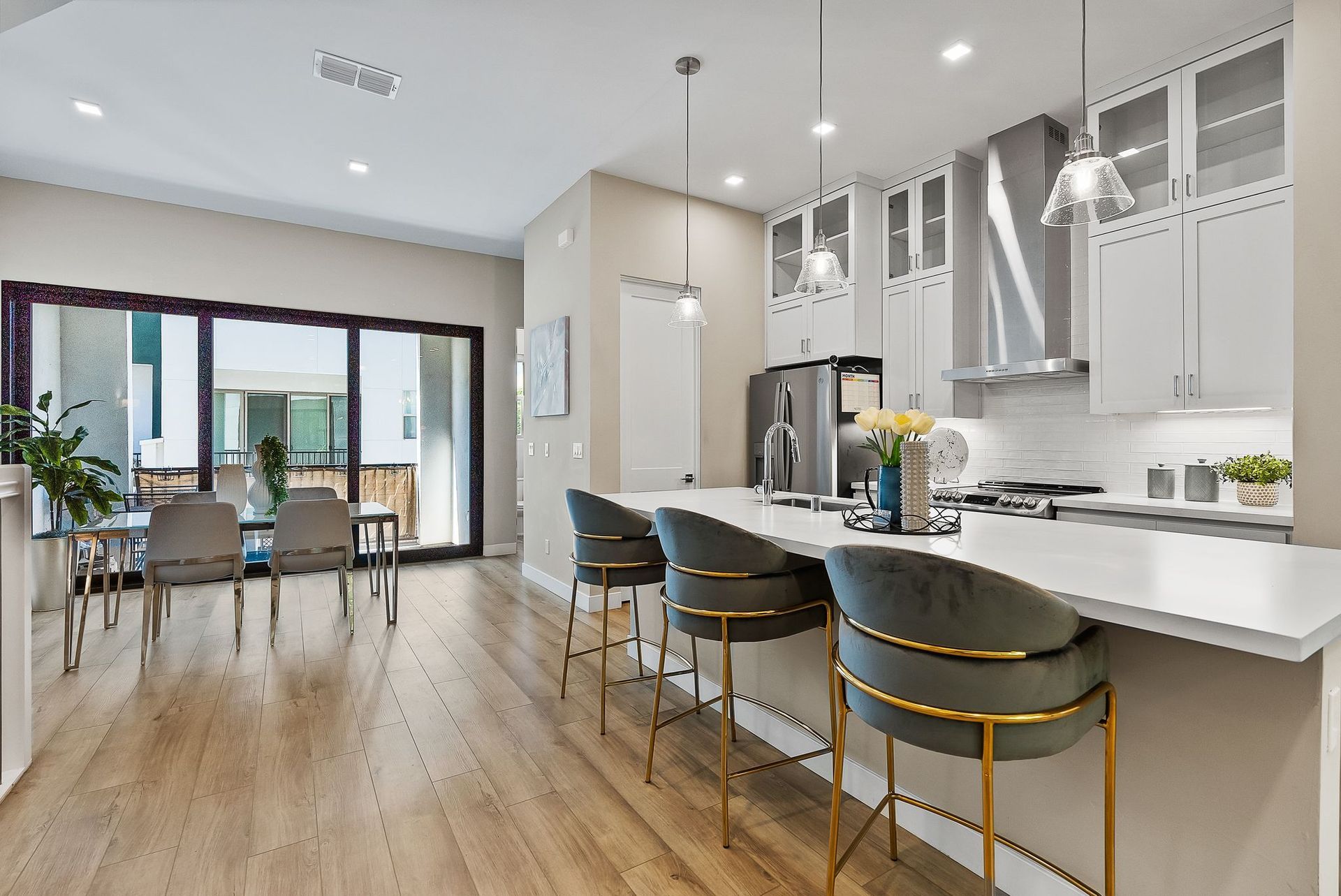 Spacious kitchen with quartz counter tops, sleek cabinets, center island and stainless steel appliances. The kitchen overflows to the warm and inviting living room with picture perfect window!