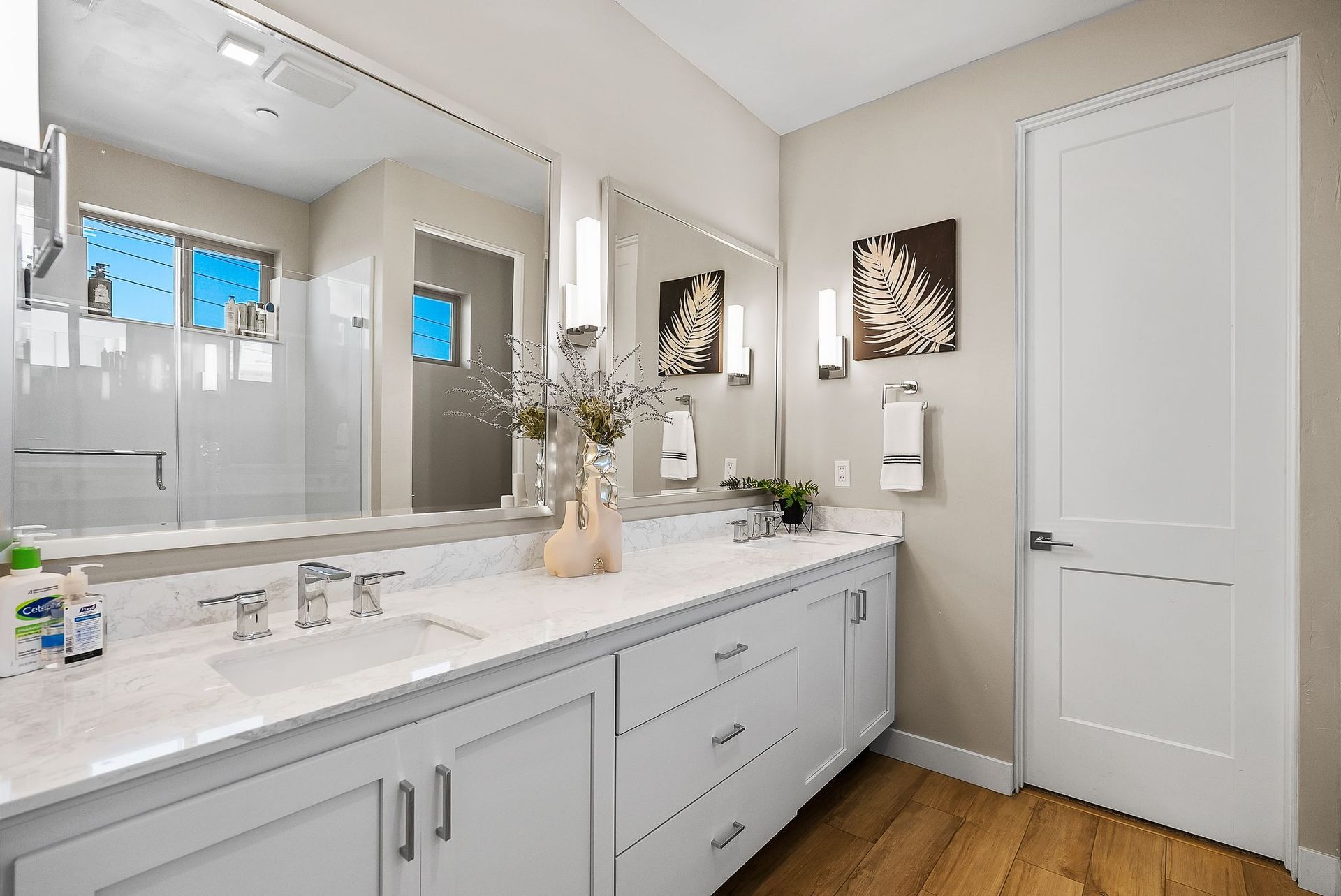 The over-sized Primary suite has a luxurious bath, complete with dual sinks and shower with gorgeous stone surround.