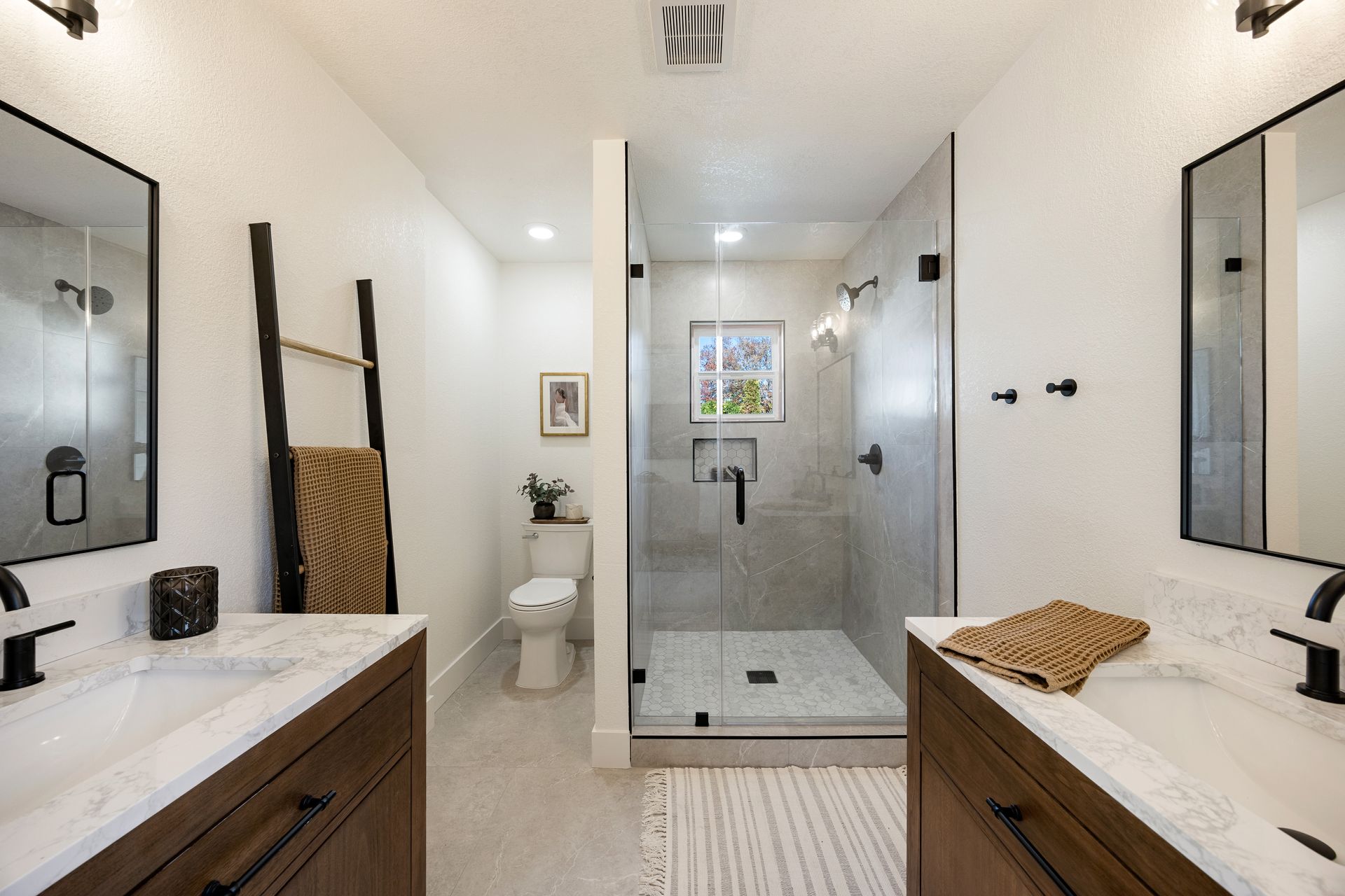 modern shower surround, all framed by black fixtures for a bold contrast.