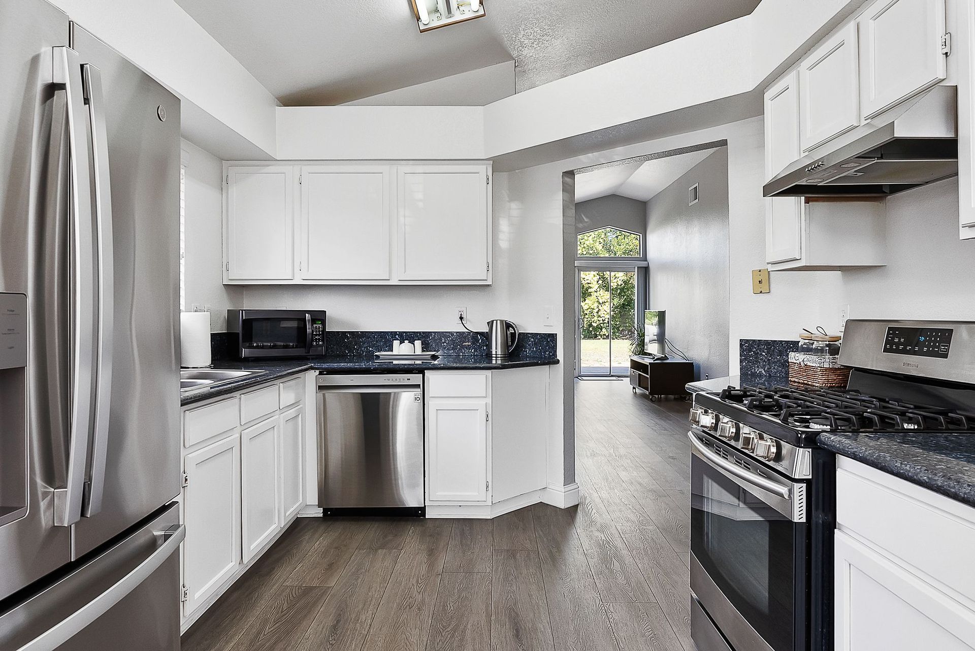 Welcome to this beautifully maintained single-story residence in Sacramento, offering move-in ready convenience. This 3-bedroom, 2-bathroom home includes a spacious two-car garage & sits on a generous .23 acre lot. Inside, you’ll find stylish, recently installed wide plank vinyl flooring throughout, soaring vaulted ceilings, a cozy fireplace & an abundance of natural light. The open-concept main living area seamlessly combines the living & dining spaces, ideal for everyday living & entertaining. The kitchen is equipped with ample white cabinetry, sleek quartz countertops & stainless steel appliances. A charming breakfast nook provides a peaceful view of the backyard. The expansive primary suite features a private bathroom with dual granite-topped vanities, rich wood cabinetry & recently updated walk-in shower. All bedrooms are well-sized with ample closet storage. The indoor laundry area adds to the home’s convenience. Step outside to a vast backyard that offers privacy & limitless potential, perfect for adding a pool, garden, or outdoor BBQ area. Enjoy quiet afternoons on the patio, ideal for relaxing or entertaining. Recent updates include a new HVAC system (2022), water heater (2019), fencing (2021) & roof (2021). The location is highly convenient, just minutes from HWY 5 & 99, schools, shopping centers, public transit, Consumnes River College & Medical Facilities.