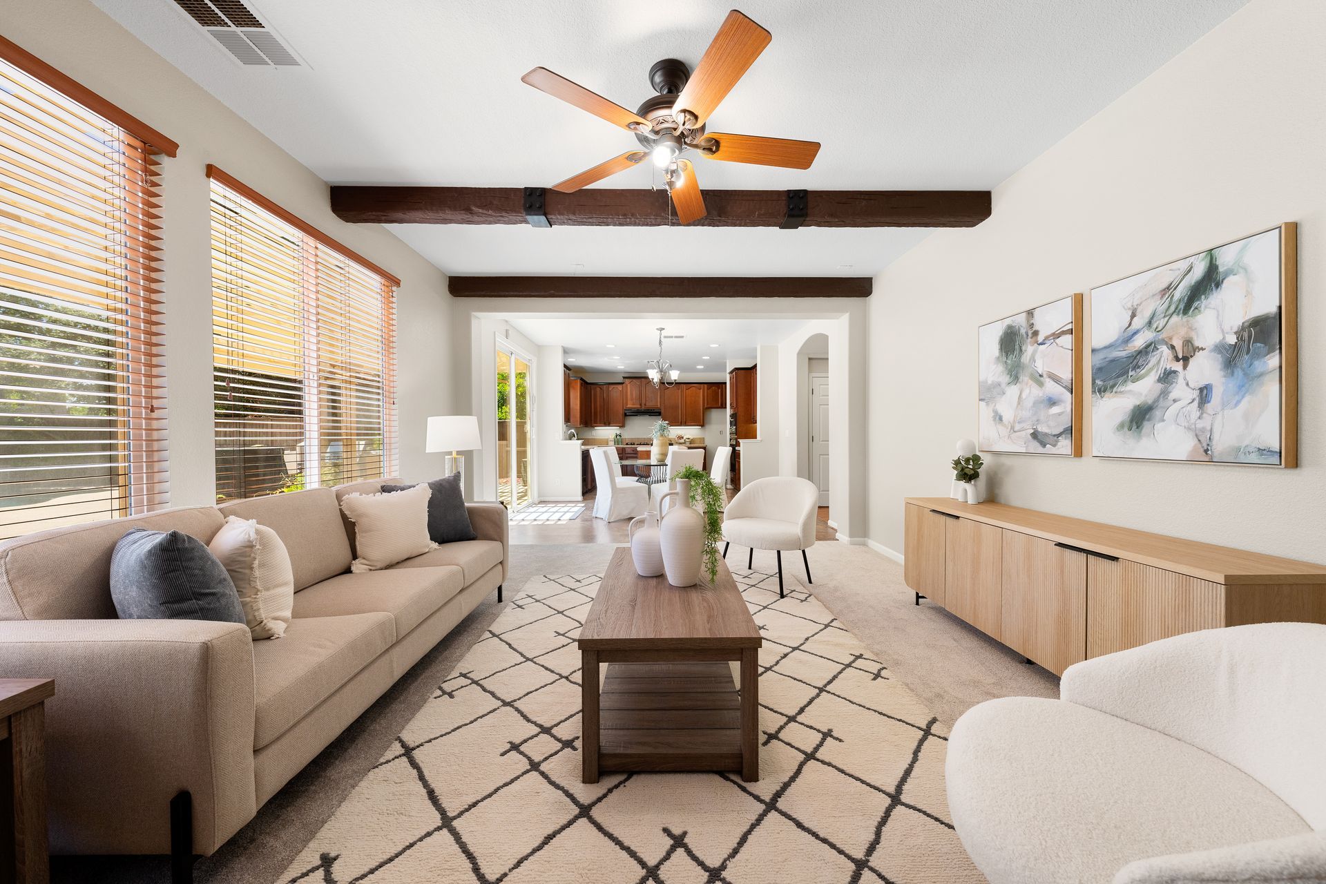 Spacious kitchen with lots counter tops, sleek cabinets, center island and butlers pantry. The kitchen overflows to the warm and inviting family room with open beam ceiling.