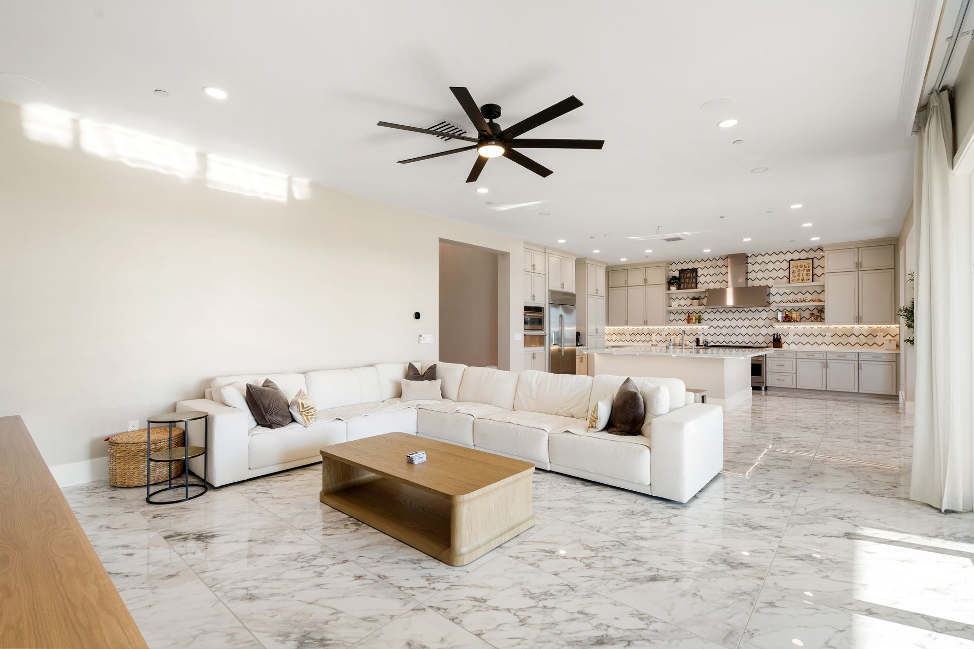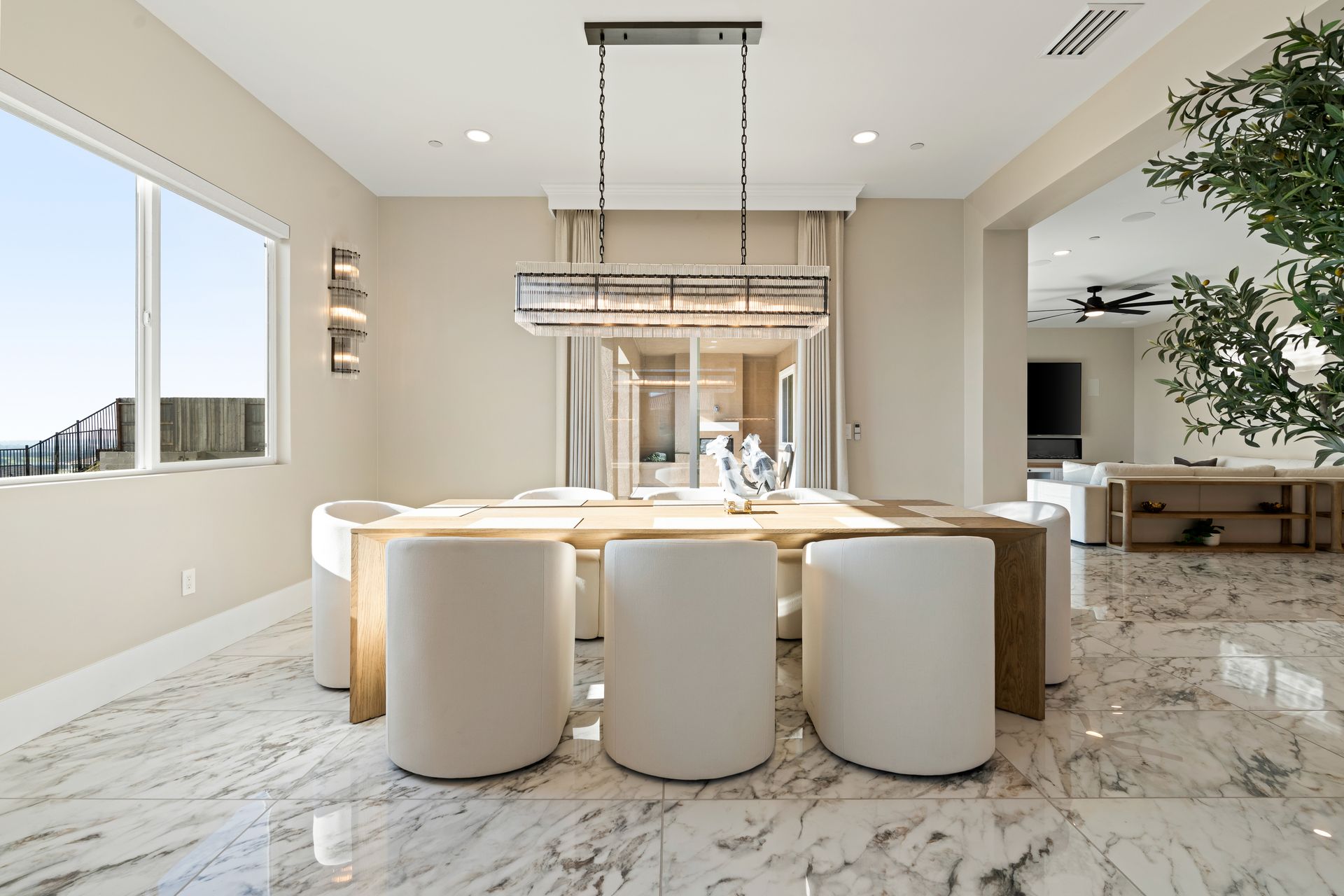 This exquisite gourmet kitchen is a true showpiece, thoughtfully designed to combine refined luxury with everyday functionality. The centerpiece is an expansive quartz island, ideal for gathering, entertaining, and casual dining. Rich custom cabinetry, a stylish tile backsplash, and premium high-end appliances elevate the space to meet every culinary need. Just beyond, a formal dining area offers beautiful views and direct outdoor access, creating a seamless indoor-outdoor experience. The adjacent great room provides a warm, inviting setting for family nights and entertaining, making this open-concept space both elegant and highly functional. exquisite gourmet kitchen is a true showstopper, thoughtfully designed to blend luxury and functionality.