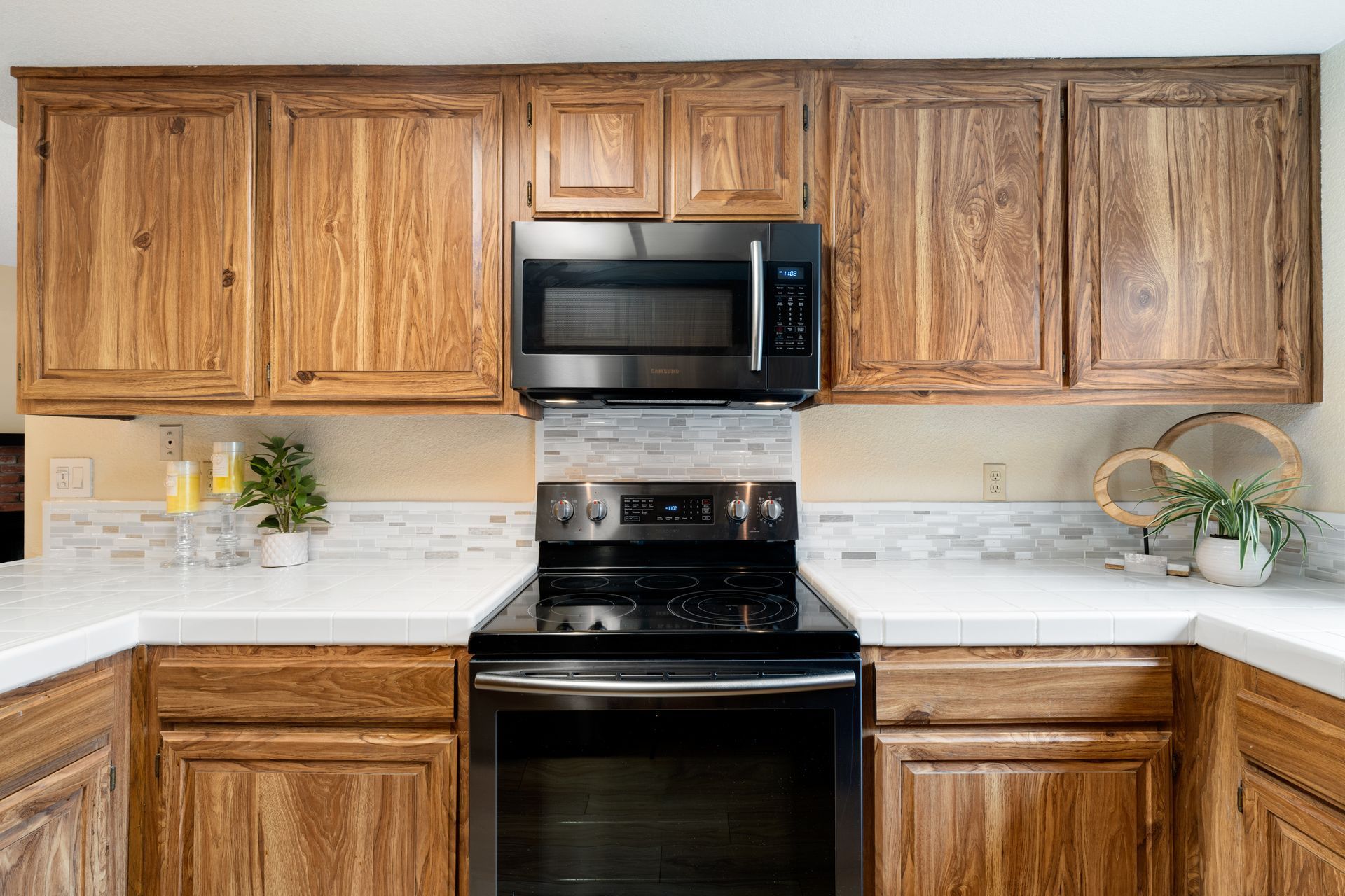 This kitchen includes stainless steel appliances, tiled backsplash, and ample cabinetry!