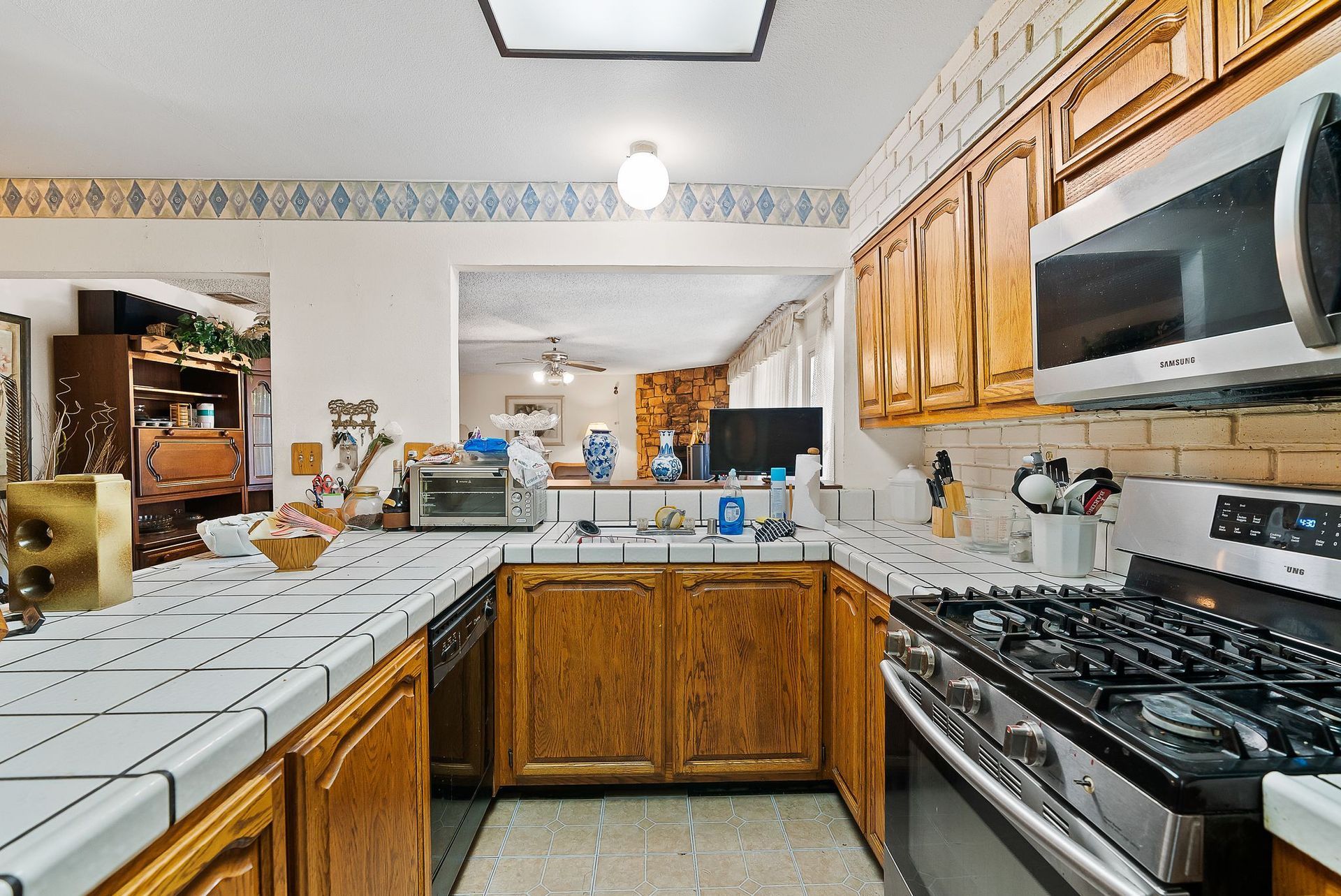 This kitchen overflows into a separate family dining area. The kitchen has plenty of cabinets and counter space!