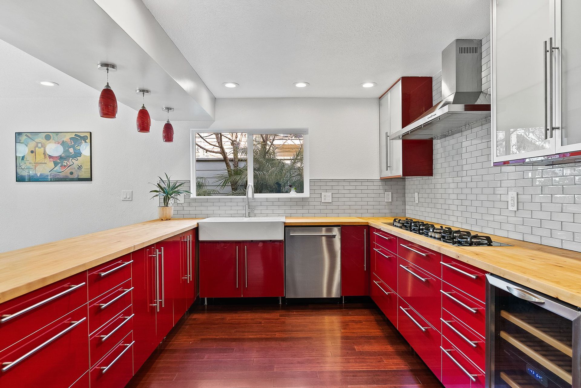 You will enjoy preparing meals in this vibrant kitchen with contemporary red cabinetry, sleek appliances, subway tile backsplash & amazing waterfall countertops. There is an awesome 6 burner gas stove and built-in refrigerator! The kitchen flows seamlessly into the dining & living areas, creating the perfect great room for both entertaining and everyday living.