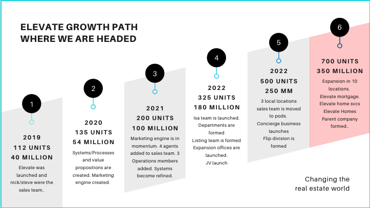 Did you know the average real estate agent makes 35,000 per year in California? 95% of agents fail out of the business within 3 years? These statistics are dismal and Elevate is on a mission to empower our agents to beat the odds and create incredible lives! Elevate is on a mission to change the real estate industry. We offer incredible programs to customers that no other real estate team can offer which gives our agents the power to have an advantage in the marketplace. We are proving that we just do real estate better period for customers. This empowers our agents to 10x the status quoe.